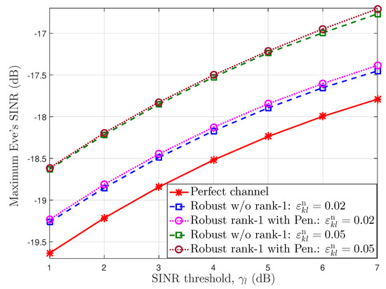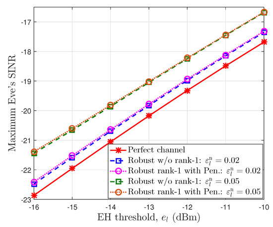 In Figure 5, we reveal the impact of EH thresholds on the eavesdropper’s SINR for the different channel error bounds with downlink SINR threshold . Similar to Figure 4, a perfect channel provides the lowest eavesdropper SINR. When the EH threshold becomes larger, the eavesdropper SINR also increases. The users have to reduce the value of the PS factor in the power-splitting unit for energy harvesting, i.e., rising the part of the received signal power that is transferred to the EH unit. It means that they need to increase the information power of intended signal to obtain the required SINR threshold. Moreover, the higher error bound allows more information leakage to the eavesdropper, since the BSs must share more power for signals and must decrease the AN interference power. For an imperfect channel, the proposed iterative algorithm with a penalty function satisfying rank-1 constraints obtains a result for the eavesdropper’s SINR that is a little higher than that of the robust case without rank-1 constraints.
