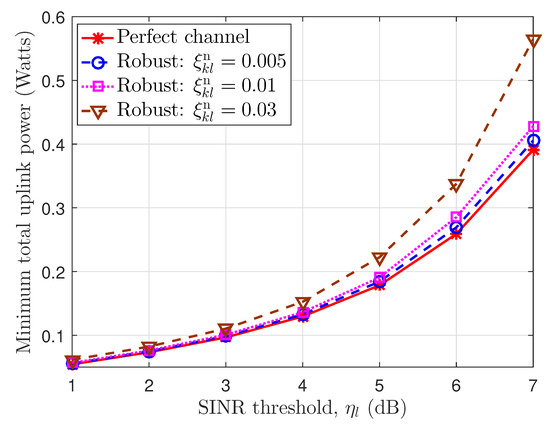In Figure 6, we present the maximum total uplink power according to the SINR threshold at the BSs under perfect CSI and imperfect CSI with uplink error bounds . As seen in Figure 6, the perfect channel provides the lowest power values, and the imperfect uplink channel gives higher values via the larger uplink error bounds as well as the SINR threshold. For example, at the required SINR threshold, , the minimum total uplink power achieves according to the perfect channel, the imperfect channels with normalized error bounds, , respectively. The reason is that the users must expend more energy to compensate for the errors and to guarantee the receiving SINR at the BSs.