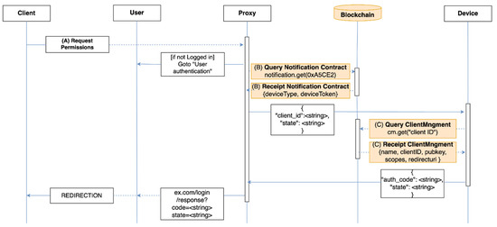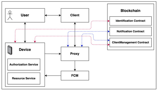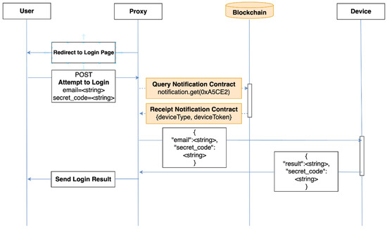 - The proxy acquires the device token of the user from the notification contract of blockchain. The proxy notifies the user device that an authentication request arrived using this token.