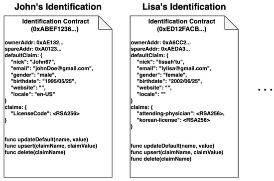 An identification contract stores the personal information of the user and it provides appropriate information to granted clients. As shown in Figure 4, a user’s personal information is expressed in one default claim and multiple claims where a claim is a statement describing a specific attribute of the subject. The default claim comprises the user’s basic information, such as the email address, nickname and gender, and it is disclosed to the public without being encrypted. Other than the email address and nickname, users can choose whether to provide the items in the default claim. Besides the default claim, users can create various types of claims, depending on the purpose of the claim. Each claim is stored in an encrypted form and those claims are managed as key-value pairs. Users can create, edit and delete the default claim and other claims using their identification contract, which is supported by update, upsert and delete functions. This contract also has an access control mechanism, which ensures that only the proper owner executes the functions.