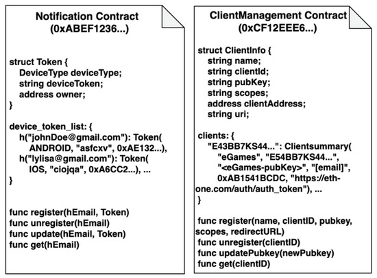 In VaultPoint, three types of smart contracts are deployed and executed in blockchain. The notification contract and client management contract are deployed in the early phase of system set-up and each operates in one instance. The identification contract operates in different instances by each user and users generate their instance following the user registration process in Section 3.2.1.