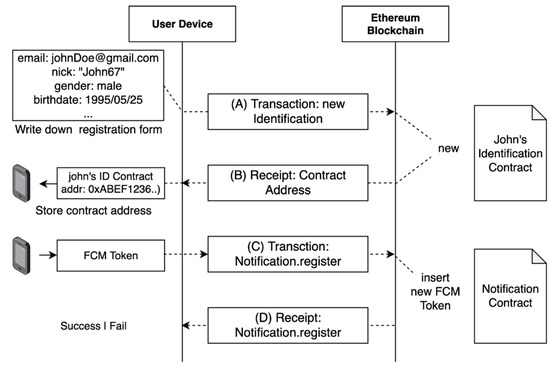 - Blockchain executes the transaction in (A) and the user’s identification contract is created. A receipt for this transaction is delivered to the user device and the identification contract address in the receipt is stored in the device.