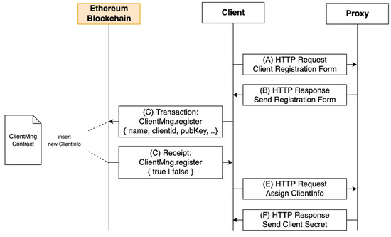 - The proxy creates a new client ID and provides a web form that contains this ID and the address of the client management contract to the client. The client writes the name of the service that he provides, a list of authorities to be granted from the user and his public key Pubc in this form.