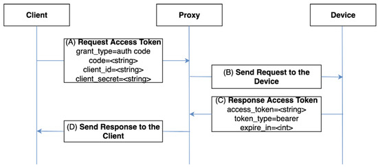 - The device verifies whether the auth code is what it created previously. If correct, the device newly issues an access token and delivers it to the proxy.