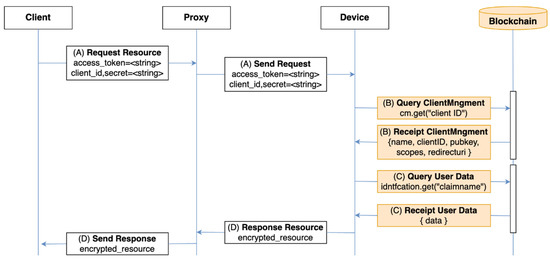 In VaultPoint, the user device performs the role of resource server and the actual user information is stored in the blockchain. This approach has the advantage that user information is not lost when the device is missing or replaced. User information is managed through the user’s identification contract. Because the blockchain data is transparent to all participants, all claims except the default claim are encrypted by the users’ private key to prevent from being exposed. The client who acquired a valid access token in Section 3.3.3 can access the user information through the following process. The flow for user information acquisition is shown in Figure 11.