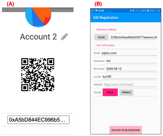 Example screenshots of user registration: (A) scanning Ethereum key and (B) writing user information.