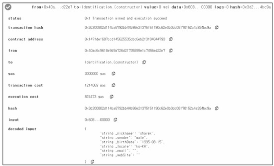 The following figures reflect the operations of VaultPoint in the experiment. Figure 12 shows an example of a user’s registration using his mobile application. The user is given a form for writing his information as shown in Figure 12B and he can write additional information once the registration is complete. The user can scan the QR code of the private key and address of his Ethereum account, as shown in Figure 12A. When the user touches the button at the bottom of Figure 12B, the user registration process in Section 3.2.1 is executed and the user’s identification contract is created. Figure 13 shows the receipt of the user’s contract creation transaction executed in Kovan testnet.