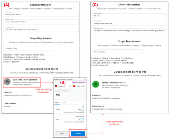 Example screenshots of client registration: (A) initial registration form, (B) register transaction submission and (C) acquisition of client secret after registration.