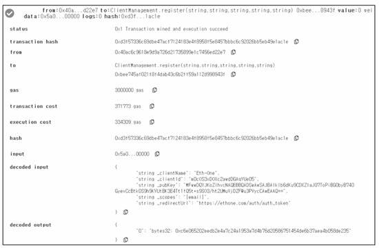 Figure 14 shows an example where a client who provides a mock service named Eth-one registers it following the process in Section 3.2.2. As shown in Figure 14A, the client requests registration to the proxy and receives a registration form to fill in the necessary information. Afterward, the client makes and submits a transaction that requests for the registration in the client management contract using its Ethereum account. This process is performed with the help of Metamask [26], which is a popular Ethereum wallet, as shown in Figure 14B and the client waits for a while until this pending transaction is confirmed and recorded in the block. Figure 15 shows the receipt of this client registration transaction. Once the receipt of the transaction is delivered to the proxy, the proxy verifies its validity and creates a client secret. The client receives this client secret as shown in Figure 14C.