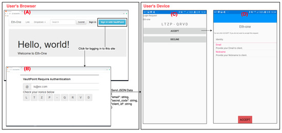 Figure 16 shows an example of the screen views that appear when a user confirms and approves the client’s authorization request and an example of user authentication that is performed during the former process. Both Figure 16A and B are displayed on the user’s web browser, whereas both Figure 16C and D are displayed on the user’s device. As shown in Figure 16A, when the user approaches the client service through the browser and touches the “Sign in with VaultPoint” button, the client requests authorization to get the user information and the user is redirected to the proxy. If user authentication is required, the proxy provides a web form having a random secret code (Figure 16B) to the user. When the user inserts his email address, the proxy delivers the authentication request to the user device using blockchain and FCM, and the device displays this request as in Figure 16C. The user verifies whether the secret code “LTZP-QRVD” displayed on his browser in Figure 16B is equal to the secret code displayed on his device in Figure 16C and selects accept. Afterward, the authorization process in Section 3.3.1 continues. The information about the client who requested authorization and requested items are displayed in the user device, as shown in Figure 16D. When the user selects the “Accept” button, a new auth code is created and delivered to the client. Afterward, the process in Section 3.3.3 where the client is issued an access token continues without any interaction with the user.