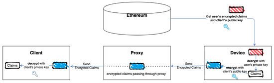 - The device gets the client’s public key Pubc from the client management contract and transfers the user information to the proxy after encrypting it with the Pubc. The proxy delivers this information to the client. Finally, the client successfully gets the requested information by decrypting it using his private key Prvc.