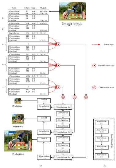The structure of GC-YOLOv3. (a) The main framework of GC-YOLOv3. (b) Convolutional set.