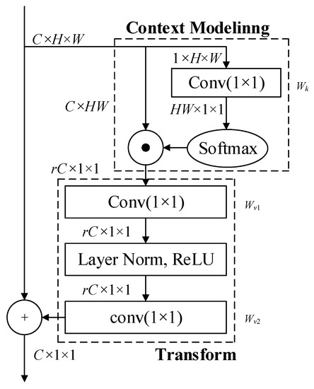 The global context block is used to enhance our model. In sequence transformation, a set of key features for mapping to the output are connected to the input and output sequence using global dependence in a self-attention mechanism. When the attention mechanism is used for image recognition, the information processed by the attention mechanism module is included in an explicit sequence of items as shown in Equation (1):