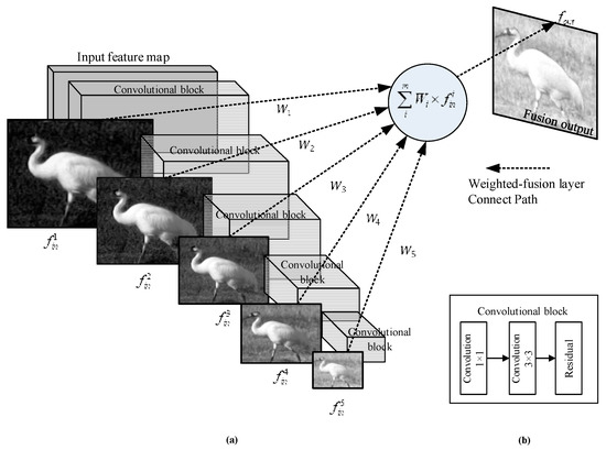 The essence of attention is a process that reduces one dimension to obtain the weights of other dimensions so that the network would pay “attention” to what it should learn and abandon irrelevant information, in which “distribution” is the most important part. By assigning larger weights to useful information, the network uses some layers more efficiently to obtain more accurate detection results and reduce training costs. In this sense, fusion is another attention mechanism. Based on the idea of DenseNet [16], all the same output feature maps between the feature extraction network and the feature pyramid network are used to maximize information transmission. Therefore, this mechanism makes full use of the output of each residual block of the same channel in our feature extraction network and optimizes the network by assigning different importance coefficients to different feature maps of each residual so as to obtain different degrees of attention at each layer. This approach is more efficient and beneficial by putting the outputs of the same channels and sizes together without reducing dimension and sampling. Figure 3 shows the structure of the learnable fusion, where (a) represents the main framework and (b) is the specific description of convolutional blocks in (a).