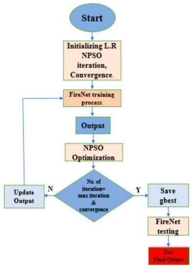 - Initialize the learning rate of the proposed FireNet model, batch size. NPSO is used to control the convergences of the model. After three iterations, if the error value does not change, then the NPSO is considered convergent;