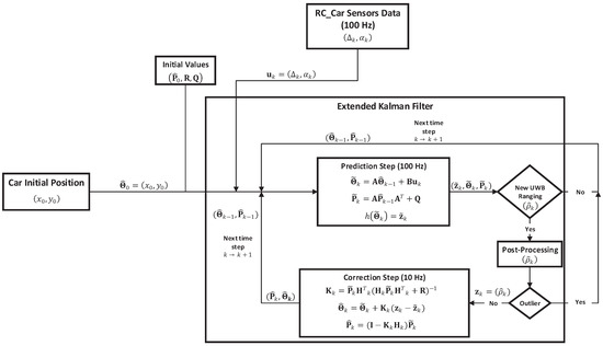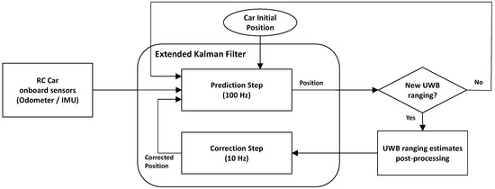 - Correcting the RC car position. This is accomplished in the correction step of the EKF. This step is applied each time a new UWB ranging estimate arrives into the system, correcting the last position of the RC car computed in the prediction step. The main idea when correcting periodically the position computed by the prediction step is to bound its positioning error over time. Note that the UWB ranging estimates are generated at a data rate of 10 Hz, indicating that every 100 ms the correction step of the EKF is applied.