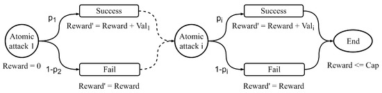 Attacker model As mentioned above, before threat analysis, we identify various attack points in the system, which are called atomic attacks. The security risk of the target system is determined by the attacker’s usage of these atomic attacks. The behavior of an attacker can be represented by Figure 3. For an atomic attack, the probability of success is p, and the attacker will get some reward, which is the value of the corresponding asset denoted by . The failure probability of an atomic attack is , and the attacker does not get any reward in this case. It is worth noting that the attacker’s choice of an atomic attack is non-deterministic. We assume that an attacker always has limited capability denoted by the variable . Therefore, in the process of an attack, the reward gained by the attacker is not greater than his/her capability. For each atomic attack, the reward obtained by the attacker is modeled as the variable . The probability value and reward of a single atomic attack can be quantified according to Table 1 and Table 2. The initial value of the reward is set to zero and then increases gradually with the success of the atomic attack. When the attacker’s reward reaches his/her personal capability, the attack process will stop.
