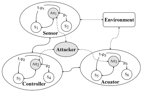 The MDP model for risk analysis is a combination of the system model and threat model, as shown in Figure 4. We built the MDP model in a modular way, including a sensor module, a controller module, an actuator module, and an attacker module. The state transitions (i.e., signal changes) of the system are described in each module, which is driven by the atomic attacks identified in each module. In particular, the attacker module describes the non-deterministic behavior when the attacker chooses different atomic attacks. As mentioned earlier, the sensor module is a collection of signals used to sense changes of the environment, including real sensors and remote messages received through V2X communication. Different modules are connected by in-vehicle networks, which describe the direction of message transmission. For example, a change of environment will change sensor output data, and then the sensor data will be transmitted to the controller through the network. Due to the participation of the attacker, the signal received by the controller may not reflect the real change of environment and therefore make a wrong decision.