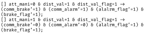 As mentioned above, our MDP model is composed of a system model, identified threats, and attacker model. For the purpose of reusability, we modeled the system model in the PRISM tool as four types of modules: an environment module, a sensor module, a controller module, and an actuator module. The environment module describes the uncertainty of the environment’s change, in our case representing the change of the vehicle’s distance and lane line. The sensor module describes the process of sensors perceiving environment changes. The controller module describes the process of how the output signal is generated according to the input signal by the controller. The actuator module describes the process in which the actuator performs corresponding actions according to the received control signals. To understand the behavior within each module, Figure 6 shows two example statements in the ADAS controller module. Variable att_mani = 0 indicates that the manipulation attack did not occur. In this case, the ADAS controller will generate control signals according to the ultrasonic sensor signal dist_val and lane_val to control the action of the engine, steering wheel, and alarm. By contrast, att_mani = 1 indicates that a manipulation attack occured, and the ADAS controller will not generate correct control signals.