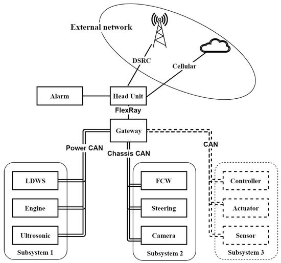 The stable operation of automotive safety-critical systems is the basis of ensuring the safety of drivers and passengers. With the increasing connectivity of vehicles, some non-safety-critical systems have become safety-critical systems inside the connected vehicles. For example, when the driver’s seat suddenly slides backward, if the driver wants to brake in case of an emergency, the driver is likely to be unable to complete the needed action. In the past, automotive engineers devoted much attention to the research of safety-critical systems to prevent these systems from failure, but they lacked experience in ensuring the security of these systems. The safety-critical system of the vehicle is composed of various electronic components, such as controllers, sensors, and actuators. These components are connected together by various internal networks, such as controller area networks (CANs), local interconnect networks (LINs), and FlexRay. These in-vehicle networks were originally designed for a closed network environment; as a result, the increasing attack surfaces make in-vehicle networks vulnerable to malicious attacks. Experimental security research in [3,4,5] has shown that malicious attacks against safety-critical systems are possible. Therefore, a complete set of security defense methods needs to be studied urgently.