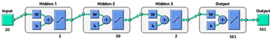 After this cross validation phase, the final structure of the ANN (shown in Figure 2) consists of 3 inner hidden layers (plus the input and output one) with 2 neurons each in the first and third, and 30 neurons in the second. The ANN has 20 inputs and 361 outputs (the values of Zin(f) at the 361 frequency points of the spectrum).