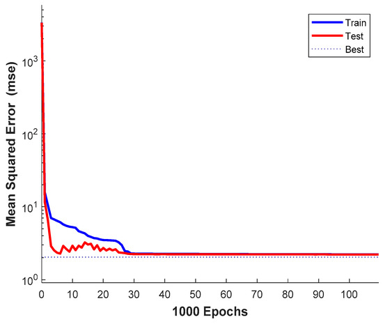 After some tests, the algorithm chosen for the training is the Bayesian Regularization algorithm [31] for its properties of generalization. This property is very important because during the GA procedure the chromosomes that are generated are not included in the input training set (although inside its boundaries) and the ANN should compute the associated output with maximum accuracy. In each of the four TSs used to train the 4 ANNs for the 4 ports, 70% of the output has been used for the training, 15% for the validation, and the remaining 15%—not included in the training set of data—for the test check [32]. Figure 6 shows how, during the training, the proposed ANN converges very rapidly (in less than 100 epochs) and steadily to low values of MSE for both the training (blue line in Figure 6) and the test (red line in Figure 6) sets. The MSE of the test set reaches a minimum at an epoch number similar to that at which the MSE of the training (and associated validation) set reaches the minimum; thus also confirming a correct subdivision (70%, 15%, 15%) of the TS. From Figure 6, it is evident as the MSE of the test set drops from about 5000 to 1.7 in less than 100 epochs, and then remains still (although not shown) up to 1000 epochs.