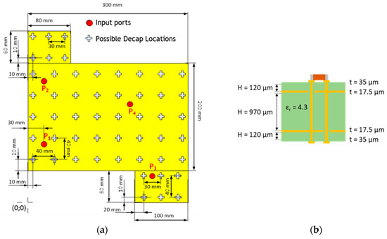The PCB briefly introduced in Figure 3 is manufactured and tested. The board dimensions and stack-up are reported in Figure 11. A second optimization run is performed based on the GA algorithm described in Section 3 that places one decap iteratively by searching for the best value and location among all the available positions identified in Figure 11a. At each iteration, the GA calls Np·Ngen times the ANN developed in Section 2, with Np = 10 and Ngen = 10. The optimization process is much quicker when using the ANN rather than the direct DF simulator, taking 0.7 s and 30 s for each impedance calculation, respectively.