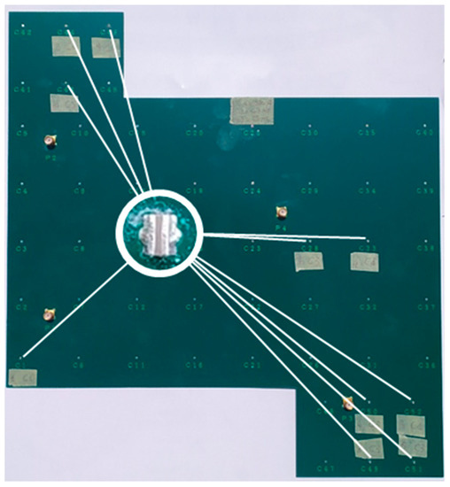 The decap placement in Figure 12a is used for assembling a test board according to the geometry in Figure 11. The PCB with the identification of the decaps is shown in Figure 13. The measurement results are reported in Figure 14 for two of the four measured input impedances at Port 1 and 3. The measured impedances are compared to the impedances predicted by the ANN output at the final tenth iteration and to the accurate calculation provided by the DF simulator. The mask and the impedance of the bare board are also included. The measured impedance agrees well with one obtained from the DF simulation. In accordance with that already mentioned in Section 2.3, in this experimental case, the impedance predicted by the ANN shows a general agreement with the simulated and measured data. In the capacitive region (frequencies below the first resonance) the agreement is good. Moreover, in this case, the sharp anti-resonance following the first resonance at 9 MHz is not captured by the ANN. From 10 MHz to the beginning of the electromagnetic distributed behavior (around 200 MHz), the impedance values from the ANN output also match the measured one very well. Above 200 MHz (such frequency value is usually much beyond the frequency limit for which the PDN and decap placement needs to be optimized), the probably induced numerical damping is evident.