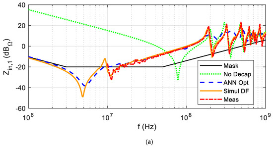 In this field, one of the last (most recent) areas to be approached by this paradigm is the design of electronic hardware. The reason is the complexity of the problem, the huge variety of the domain of application, the interlaced design rules and/or design strategies [1,2,3,4]. In particular, AI comes to help the design and optimization of printed circuit boards (PCB) in terms of layout, component placement, interconnect routing, channel and equalization optimization [5,6]. A key aspect in the PCB design of modern electronic systems dealing with high speed digital signals and lower DC voltages is the huge demand of current required by the ICs. Such a current generates a high frequency voltage ripple overlapped to the DC level that, in turn, may degrade the digital signaling [7,8,9]. Proper decoupling strategies should be adopted at the chip, package and PCB level to ensure that the induced voltage noise is maintained within a specified range [10,11,12,13,14,15]. To this aim, optimization algorithms have been shown to effectively solve this problem [16,17,18,19] by achieving the input impedance seen at the power input terminals of the chip (or package) to be lower than the target impedance set by the voltage noise constrains in time domain.