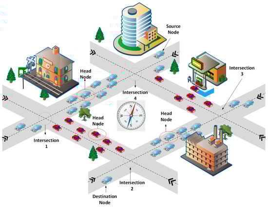 It is clarified that head node selection is performed on the same road segment, so Euclidean distance is considered in Equation (4). Furthermore, the selection is carried out by not only considering distance rather over the other parameters discussed in Section 3.2, Section 3.3 and Section 3.4.