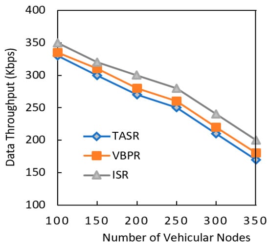 Another performance metric that was analyzed was data throughput, as shown in Figure 7. The data throughput of all the considered protocols consistently decreased due to the routing metric calculation involving more nodes in the network. However, the existing protocols had less data throughput than the proposed protocol. This result also indicated that data throughput decreased when the network had a greater data load in the presence of a greater number of nodes. The TASR protocol steeply decreased throughput because this protocol initiated the decision based on distance, direction, and signal strength. Though the nodes in more congested road sometimes had strong signal strengths, they often had more delay and less throughput due to higher number of vehicle nodes. The proposed protocol addressed this issue by selecting the maximum traffic density road segments, and it thus had better data throughput results.