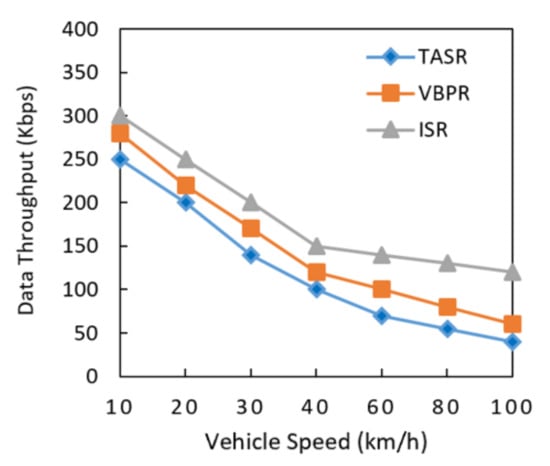 Data throughput was analyzed in the presence of different vehicle velocities, as shown in Figure 11. The data throughput of the proposed ISR protocol consistently decreased due to its routing metric calculations and greater amount of nodes in network. However, the existing protocols had lesser data throughput than the proposed protocol. This result also indicated that the data throughput decreased when the network had a greater data load with different vehicle velocities in the network. The TASR protocol steeply decreased throughput because this protocol initiated the decision based on distance, direction, and signal strength. Although more vehicle nodes centric congestion on roads sometimes show stronger signal strengths for communication. However, longer delay and lesser throughput are some other network challenges due to the different vehicle velocities on roads. The proposed protocol addressed this issue by selecting the maximum traffic density road segments, and it had better data throughput results.