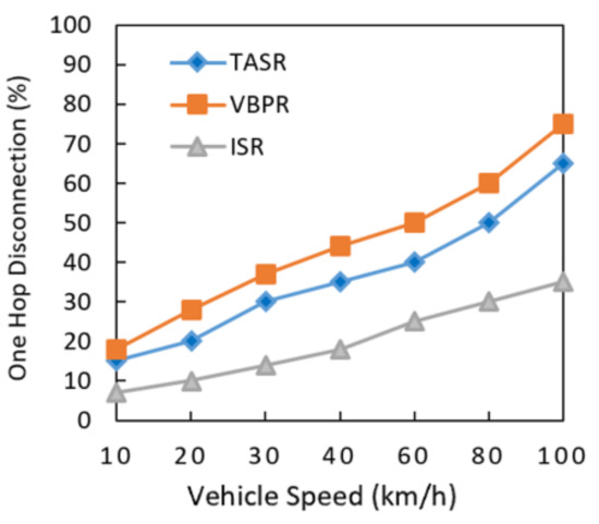 One hop disconnection, as shown in Figure 12, was analyzed in the presence of different vehicle velocities. It can be clearly observed that the one hop link disconnection of ISR was nominal, as compared to other two existing protocols. It was also observed that with different vehicle node speeds, the one hop disconnection increased. However, the one hop disconnection of the proposed ISR protocol consistently increased due to its routing metric calculations and greater amount of nodes in the network. However, the ISR protocol has shown lesser one-hop disconnections than the other two existing protocols. This result also indicated that one hop disconnection increased when the network had a greater data load in different vehicles speeds. The TASR protocol had a steeply increased one hop disconnection because this protocol initiated the decision based on distance, direction, and signal strength. Although the more vehicle nodes centric congested roads have strong signal strengths for communication, however, in this network environment longer delay and more one-hop disconnections are other issues considering different vehicle speeds. The proposed protocol addressed this issue by selecting the maximum traffic density road segments, and it had a lower percentage of one hop disconnections.