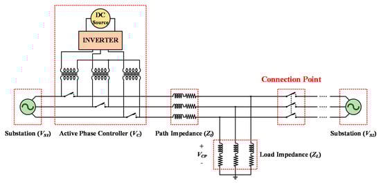 In addition, the distribution network may be arbitrarily connected or separated to ensure optimum power supply to each line [,,,,]. However, uncontrolled circulating current and inrush current are generated in the line when the voltage and phase between the lines are different from each other at the connection point (CP). If an overcurrent flows into the line in this way, the peripheral circuit breaker malfunctions, which can result in unexpected power outage. Therefore, a method for matching the voltages and phases at the connection point is necessary. In this paper, we introduced an active phase controller (APC) for the autonomous reconfiguration of lines based on the 6-switch inverter. As shown in Figure 1, the APC is connected in series behind the substation. Furthermore, it controls the phase of the connection point through generation of a voltage drop by inserting serial compensation voltage (VC) into line. Moreover, the magnitudes of the active power and reactive power output to the APC vary based on the load impedance and the adjusted phase [,,,,,]. Considering this, analysis was performed based on various APC installation scenarios, and the optimal connection point voltage of the APC was calculated using the formulas provided herein to enable efficient control.