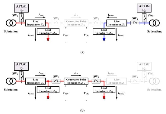 Figure 2a depicts the situation before autonomic reconfiguration between the lines. Normally, load impedance#1 and load impedance#2 receive power from substation#1 and substation#2, respectively. At this time, if a problem such as increased demand power or exceeded maximum allowable capacity occurs in substation#2, the problem is alleviated through autonomic reconfiguration between the lines, as shown in Figure 2b. However, uncontrolled circulating current and inrush current are generated in the line when the voltage and phase between the lines are different at the connection point. Owing to this difference, if an overcurrent flows into the line, the peripheral circuit breaker malfunctions, which may cause an unexpected power outage. To resolve this, an APC is installed behind each substation. Specifically, the APC is installed in series with the substation (VS) to apply a serial compensation voltage to the line, and the voltage between the connection points is matched using a voltage drop. As a result, the magnitude and phase of the voltage at the connection point are equal to those of the voltage applied to the load impedance. The actual magnitude and phase of the voltage at the connection point were measured through a phasor measurement unit (PMU). In addition, the line impedance exists in series with the substation, whereas the load impedance exists in parallel. Furthermore, if line expansion and load fluctuation are neglected, each impedance and power factor could be treated as a constant.