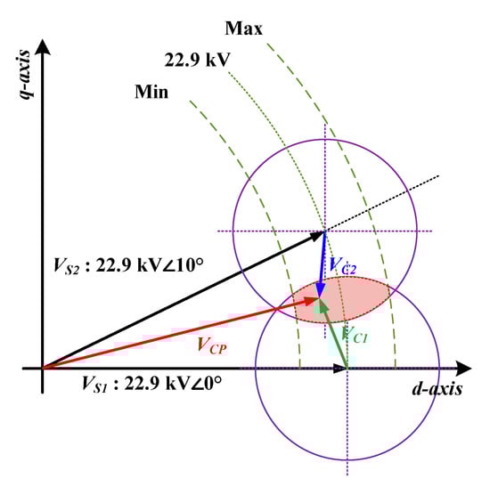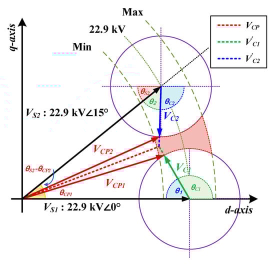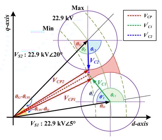 The magnitude and phase of the serial compensation voltage (VC1) are 2000 V and −93.76°, respectively. By modifying the second law of cosines as shown in Equations (15) and (16), the voltages VCP1 and VCP2 of each connection point can be calculated.
