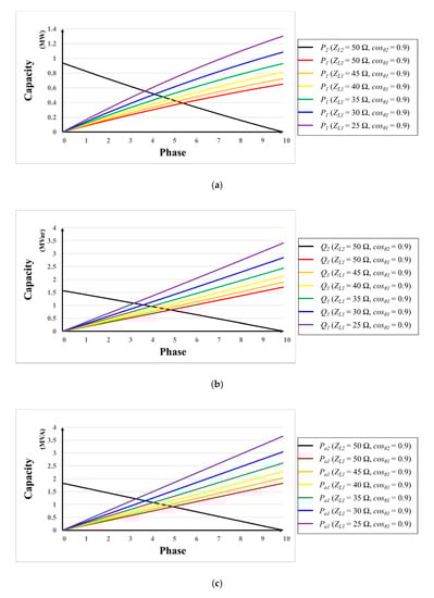 APC (active phase controller) capacity according to load impedance variation when the lagging power factor (PF = 0.9) is constant. (a) Active power; (b) reactive power; (c) apparent power.