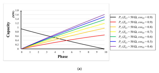 Figure 6a depicts the active power of the APC as the magnitude and power factor of the load impedance#1 (ZL1) decreases. As mentioned above, the magnitude and phase of the current flowing into the controller increase inversely with the magnitude and power factor of the load impedance#1 (ZL1). Therefore, the active power slope of APC#1 increases the most steeply owing to an increase in current and a decrease in phase difference.