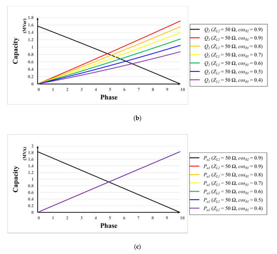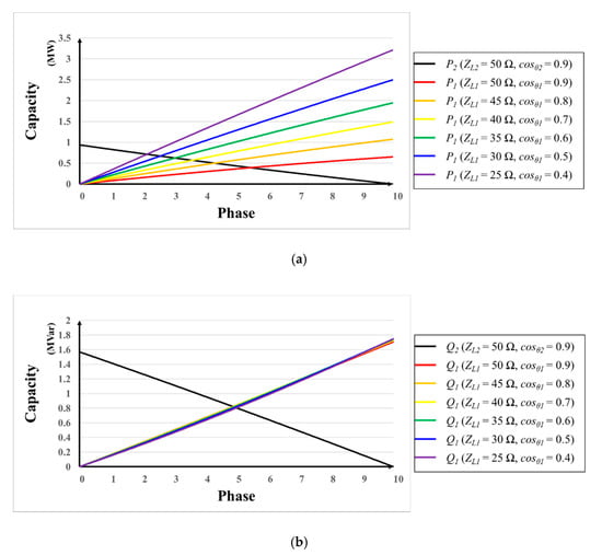 In Figure 6b, the reactive power of the APC is plotted against the decreasing magnitude and power factor of the load impedance#1 (ZL1). As mentioned above, the magnitude of the current flowing into the controller increases in inverse proportion to the magnitude of the load impedance#1 (ZL1). However, the phase difference due to the phased reduction of the current decreases. Therefore, it can be seen that the reactive power slope of APC#1 is maintained almost constant.