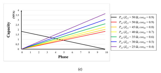 Figure 6 shows the active power, reactive power, and apparent power of the APC against variation in magnitude and power factor of the load impedance. As shown in Table 3, the magnitude and power factor of load impedance#2 (ZL2) were assumed constant at 50 Ω and 0.9, respectively, whereas those of load impedance#1 (ZL1) were varied for comparative analysis.
