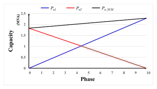 Figure 7 shows the outputs of APC#1 and APC#2 based on the parameters applied to the simulation in Table 4. Table 5 shows the capacity of each APC according to the phase matching point. When the voltage phase between distribution lines is matched at 0°, APC#1 does not function; as a result, the output of APC#1 is 0 kVA. In this case, the voltage phase is matched by driving only the APC#2; consequently, the output of APC#2 is 1830 kVA. Moreover, the total APC synthesis capacity is approximately 1830 kVA, which is the smallest value. However, in order to operate the system efficiently, APC#2 must accommodate all the phase control burdens.