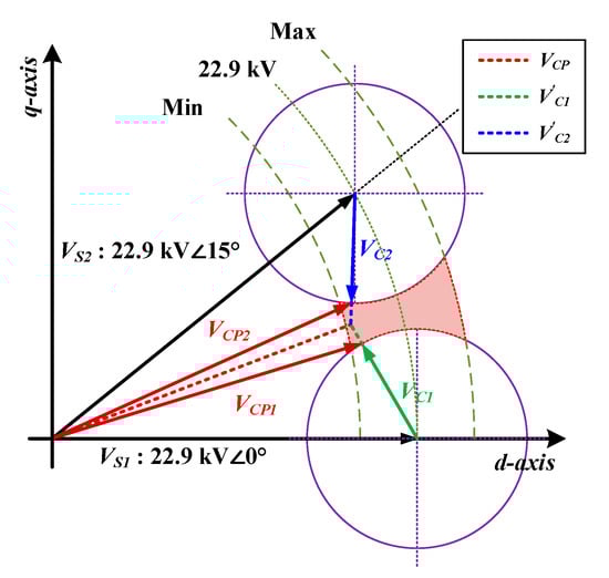 In Figure 8, the magnitude and phase of the voltage at substation#1 are 22.9 kVA and 0°, respectively, whereas those at substation#2 are 22.9 kVA and 15°, respectively. This is the case when the phase difference between the lines is larger than that originally expected after the APC was installed, and the output of the APC is insufficient. As shown in Figure 8, the voltage phase must match the phase at the VCP, but it is impossible because the output of the APC is insufficient.