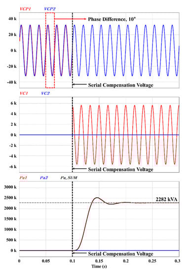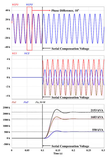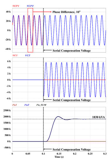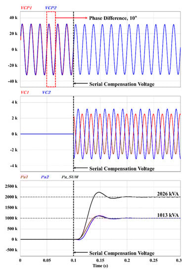 In Figure 14, the simulation result waveforms are plotted considering the voltage phase coincidence point as 4.42°. The reference value of the connection point voltage calculated from Equation (12) was applied to the controller. It can be seen that not only the voltages between the lines coincide with each other, but the outputs of both the APCs are 1013 kVA. The synthetic capacity of APC is 2026 kVA, which is somewhat higher than that in case of matching the phase at 0°. However, the output of the APC is evenly distributed, and efficient operation is possible. In the simulation results, the capacity of the controller differs according to the voltage phase coincidence point, and the magnitude of the serial compensation voltage increases as the interval to reach the coincidence point increases.