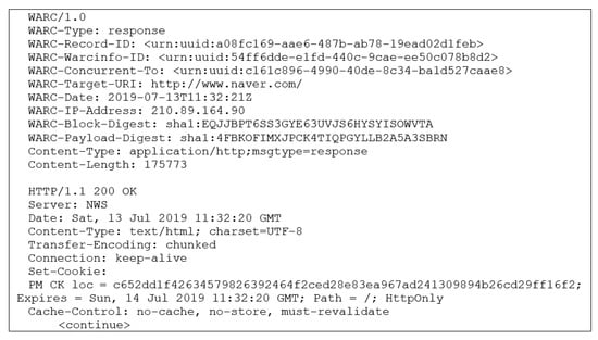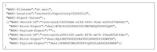 - International Internet Preservation Consortium. The WARC Format 1-1. Available online: https://iipc.github.io/warc-specifications/specifications/warc-format/warc-1.1 (accessed on 1 September 2019).