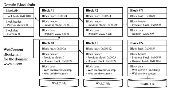 The blockchain block in the first level which named domain blockchain contains a domain name, and a new block will be added in case a new domain is selected for web archive. The domain blockchain can be used for a web domain that exists on the web. The blockchain block in the second level which named webcontent blockchain, contains the linked information to the block in the domain blockchain and the web archive retrieval information. The number of webcontent blockchain will be the same as the number of blocks at the first level. All content of a WARC file can be too big to put into the blockchain block in the domain blockchain as data due to the limitation of the block size. Therefore, only the digest value which can identify the content will be added into the domain blockchain, and the original WARC file will be stored in a file repository. This web archive method provides a way to record the web archive process activity and the content information into the blockchain to secure content integrity.