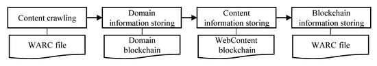 The process of the BCLinked web archiving system is shown as Figure 8. A web crawler collects web content and creates a WARC file in the content crawling stage. All WARC records are sent to BCLinked web archiving. BCLinked web archiving system checks whether the target domain exists in the domain blockchain with the WARC records. The existing blockchain node data will be used if the domain already exists or a new blockchain block will be added in the domain information storing stage. Then all WARC records are added to the webcontent blockchain block in the content information storing stage, and the block hash is added into WARC records for cross-validation in the blockchain information storing stage.