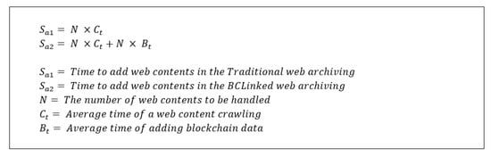 The processing time of web content archiving can be express as shown below Figure 12. The overhead time in the BCLinked web archiving system is . The time complexity for both and is the same as and is much smaller than . Therefore, this overhead time is reasonable to get the benefit from the blockchain.