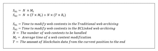 The processing of web content modification can be express as shown below Figure 13. The overhead time in the BCLinked web archiving system is mostly in updating all linked blockchain data. The worst case is that trying to modify the web content which is in the beginning position in the blockchain data. All linked blockchain data and extended defined-fields should be revised in this case, and will be the total number of all blockchain data. The time complexity for is while the time complexity for is . It shows that unauthorized content modification is almost impossible due to massive overhead processing time in the real world with the BCLinked archiving system.