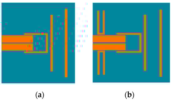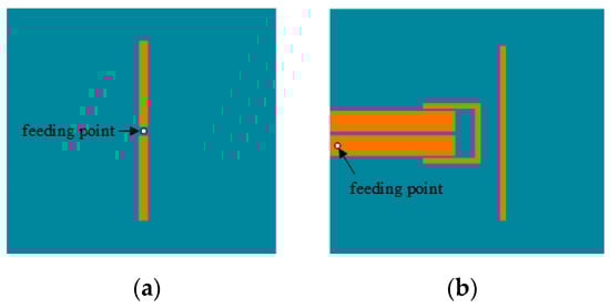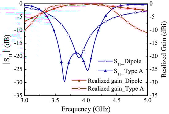 Firstly, the frequency selectivity of dipole antenna is investigated. For clear illustrating, both the conventional dipole antenna and the new dipole structure named type A are presented and depicted in Figure 2a,b, respectively. It should be mentioned that these two dipole antennas are designed on the same substrate and operate at the same frequency. As indicated in Figure 2b, for the new dipole structure, an open-circuited half-wavelength resonator has been introduced as one filtering element between the feedline and dipole. By virtue of this scheme, both the selectivity and bandwidth of dipole antenna are expected to be improved. Comparative results including reflection coefficients and normalized realized gains of antennas are shown in Figure 3. It can be observed that by inserting the half-wavelength resonator, an additional resonance point appears at about 3.65 GHz, naturally resulting in enhanced bandwidth. Besides, for the type A antenna, its in-band gain becomes flatter and the out-of-band suppression is better than the conventional counterpart, which means an improved selectivity.