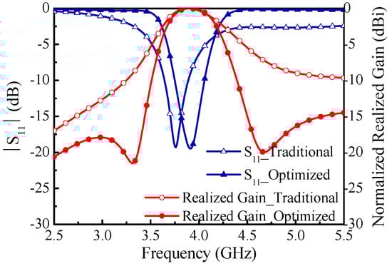 Comparison about normalized realized gain and reflection coefficient curves versus frequency between the traditional and optimized Yagi antenna.